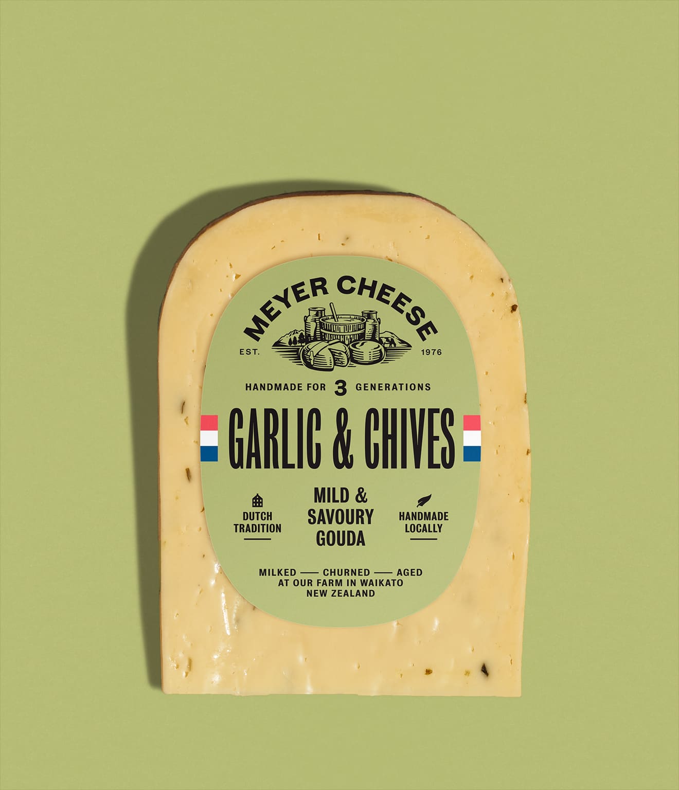 For those who love garlic, this Gouda is packed with garlic to give it a good strong flavour and the chives not only make the cheese look good but round off the sharpness of the garlic so you still enjoy the taste of cheese.
